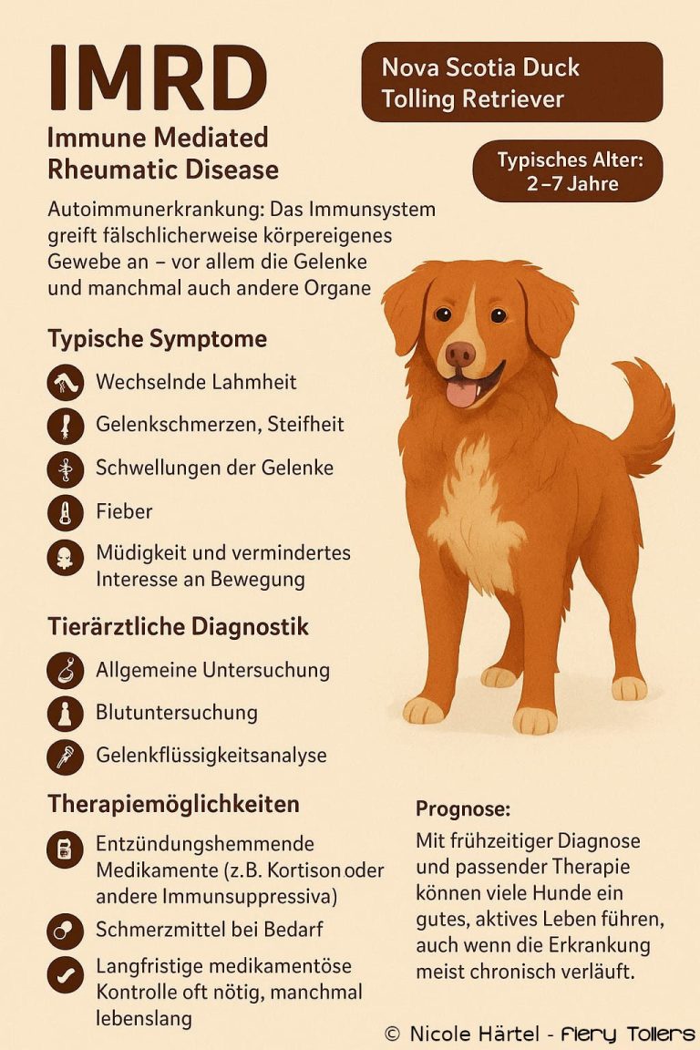 IMRD (Immune Mediated Rheumatic Disease) ist ebenfalls eine Autoimmunerkrankung, die beim Toller auftreten kann. Betroffene Hunde sind oft zwischen 2-7 Jahren alt Das Immunsystem greift fälschlicherweise körpereigenes Gewebe an – vor allem die Gelenke und manchmal auch andere Organe.